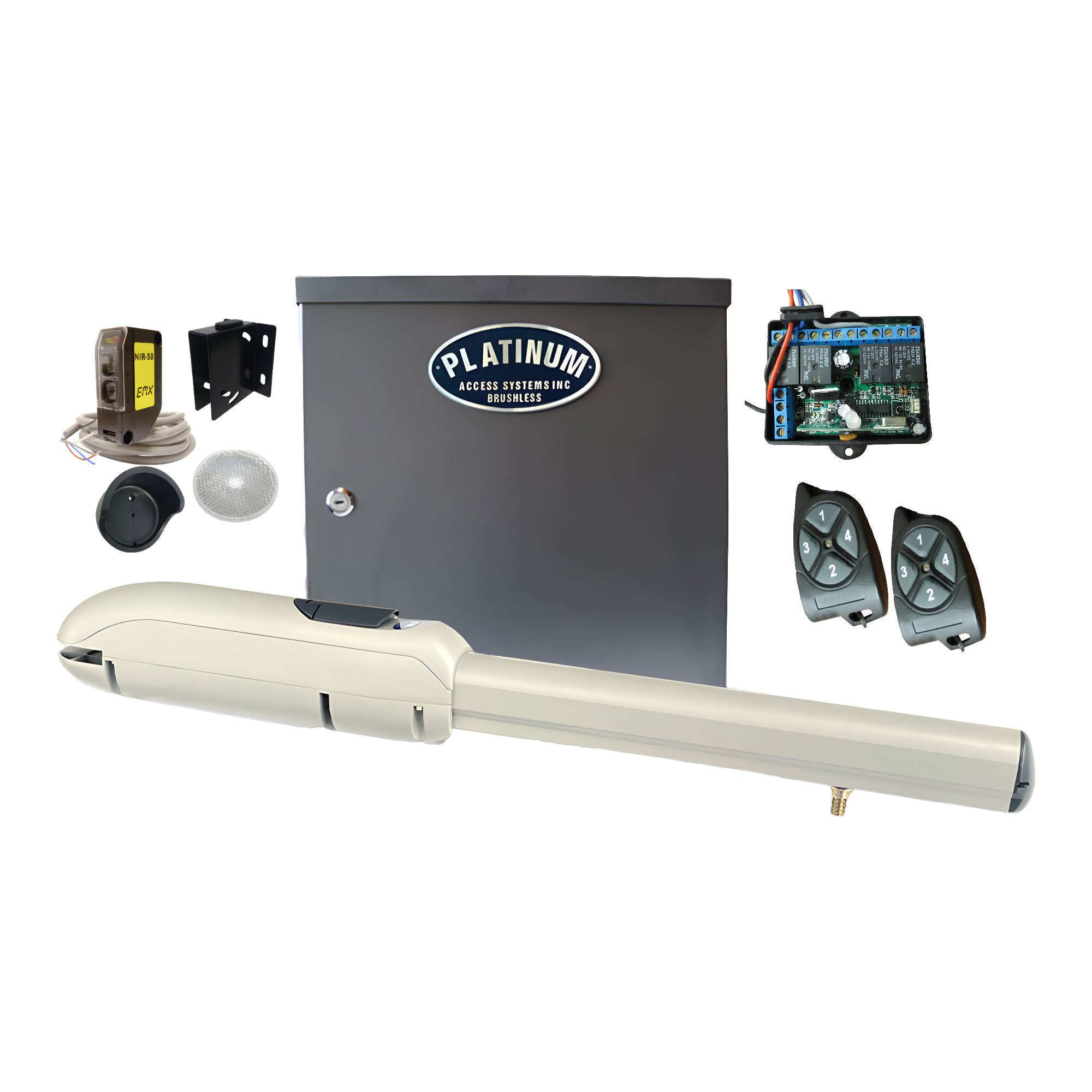 - BLACT815-MSK-B — Primary/Secondary Kit Bundle. Controller box with 2 arms, one 50 ft photoeye, one radio receiver with Hold Open function, and two transmitters.